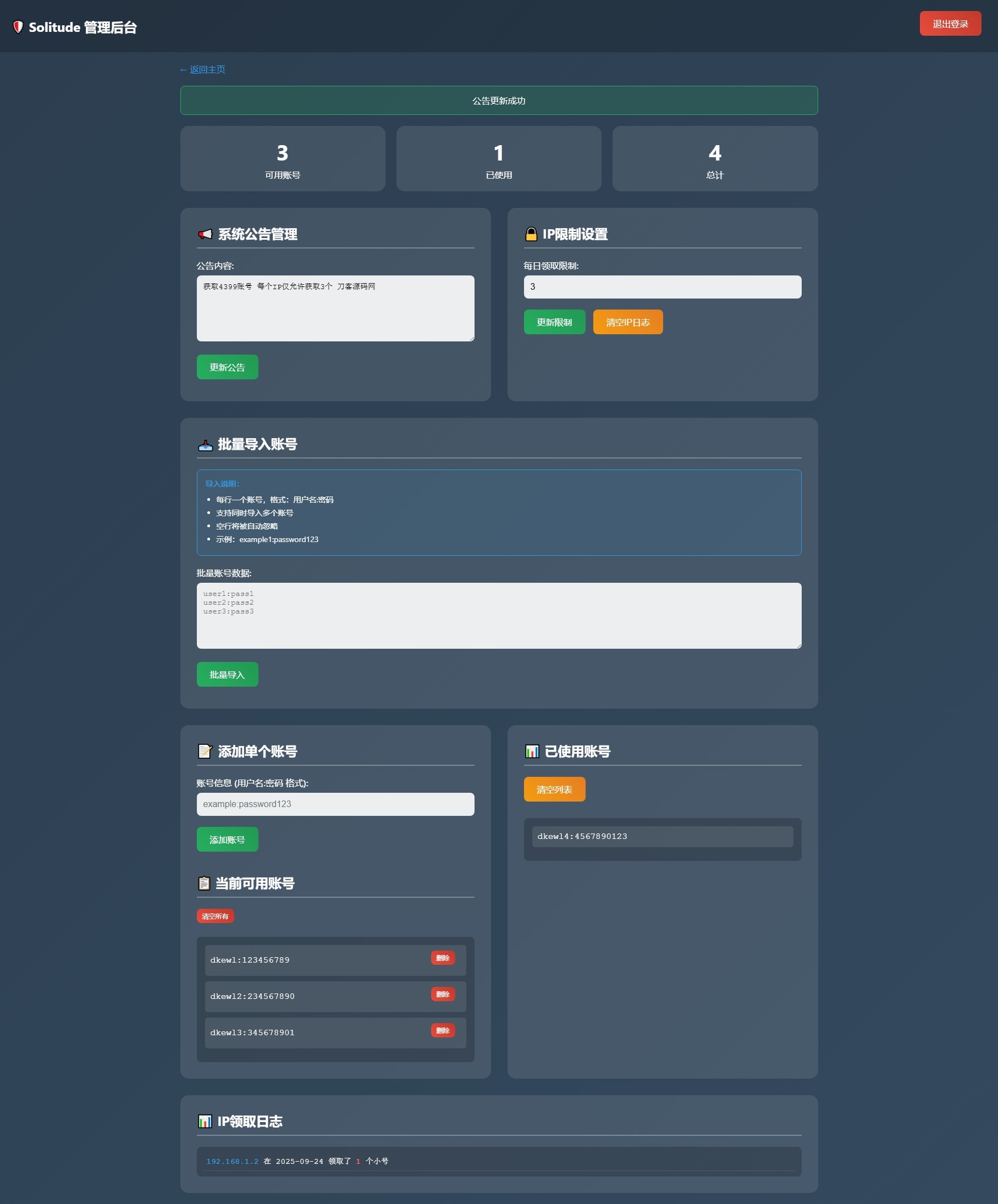 小号分发 卡密分发系统网站源码 轻量化han2771887个月前发布关注私信08430 简介: 小号分发 卡密分发系统网站源码 轻量化 此为小号分发卡密系统源码,专用于分发小号库存账号或卡密等使用,不过规定每个IP仅能领取3次,也可视作小号分发工具。 已做过简易测试,感兴趣者可自行部署使用! 图片: 小号分发 卡密分发系统网站源码 轻量化此内容为付费资源,请付费后查看5积分黄金会员免费钻石会员免费登录购买付费资源© 版权声明 文章版权声明 1 本网站名称:七七博客 2 本站永久网址:https://www.845od.cn 3 本网站的文章部分内容可能来源于网络,仅供大家学习与参考,如有侵权,请联系站长 QQ30014045进行删除处理。 4 本站一切资源不代表本站立场,并不代表本站赞同其观点和对其真实性负责。 5 本站一律禁止以任何方式发布或转载任何违法的相关信息,访客发现请向站长举报 6 本站资源大多存储在云盘,如发现链接失效,请联系我们我们会第一时间更新。 THE END网站源码 喜欢就支持一下吧点赞30赞赏 分享QQ空间微博QQ好友海报分享复制链接收藏